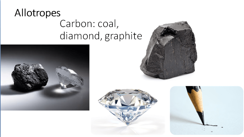 - Non metals: Coal, graphite, diamond (all are allotropes of Carbon), Sulphur, red phosphorus on matchbox