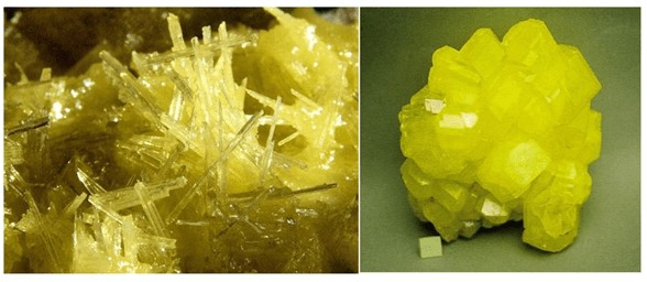 Sulphur is usually found in form of yellow powder. It can also form needle shaped crystal structure. Sulphur is poisonous. Sulphur can burn with blue flame forming sulphur di oxide gas. (SO2) it causes pollution. And can cause acid rain. Sulphur is also used in medicines like sulpha drugs. Onion, garlic, eggs contains sulphur.